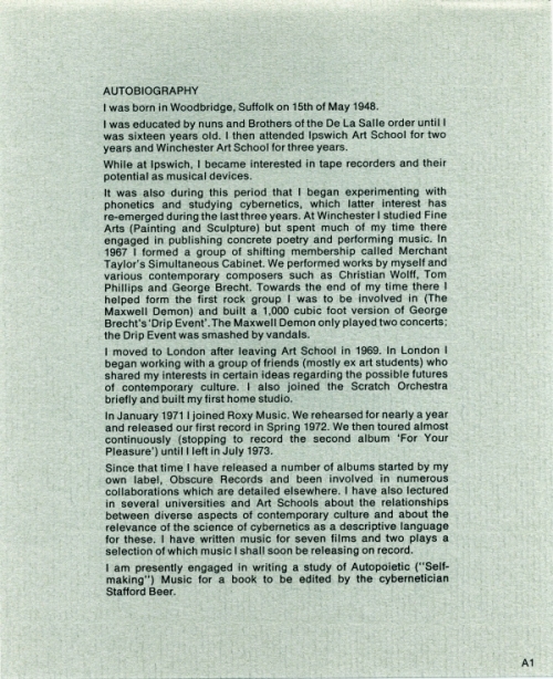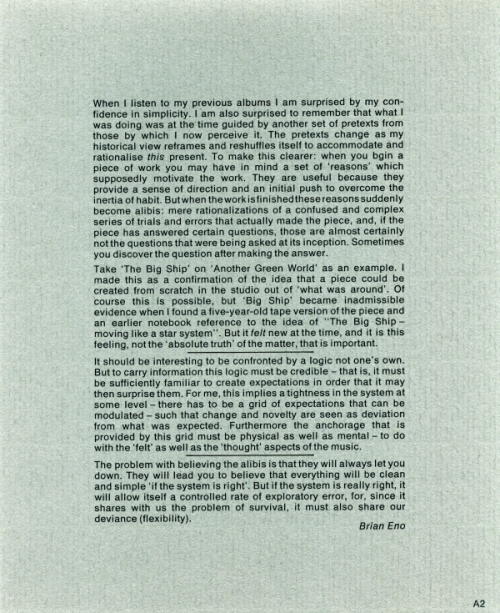 According to Richard Poynor, Eno's fascination with the concept of heuristics goes back to 1971, when he was involved in a recording of 'Paragraph 2' and 'Paragraph 7' of The Great Learning by Cornelius Cardew. Although the score imposes few constraints on its performers, Eno learnt with interest that individual performances do not diverge significantly from one another, nor does the piece degenerate into chaos. According to Eno, 'the fact that this does not happen is of considerable interest, because it suggests that somehow a set of controls which are not stipulated in the score arise in performance, and that these "automatic" controls are the real determinants of the piece.' (Eno's emphasis). For Eno, this was the beginning of a long interest in cybernetics -- Craig Clark (quoting More Dark Than Shark)