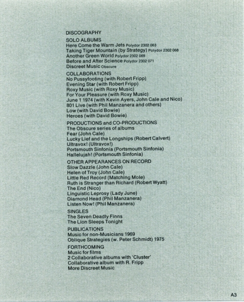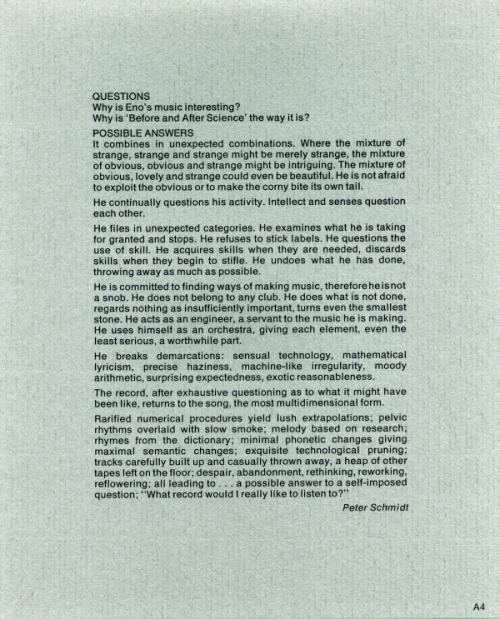 Gordon Fisher writes: Dear Enoweb, I managed to get hold of an early Japanese CD copy of Before and After Science today (the fabled 1987 "Black Triangle" version, code 32VD-1120. The sound quality on this edition is excellent and, what is more, it comes with a lyric sheet! How official this is I don't know for sure (it's an official release, but who knows where they got the lyrics). Anyway, there are some minor differences between the lyrics published on enoweb and the ones on the attached scan of the "official" lyric sheet for this Japanese edition. I thought perhaps you and some readers with an awful lot of time on their hands may be interested...