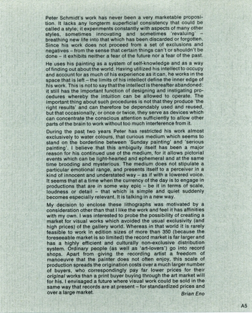 Before And After Science originally included four prints by Brian Eno's friend, artist Peter Schmidt. Ten songs plus four paintings makes Fourteen Pictures.