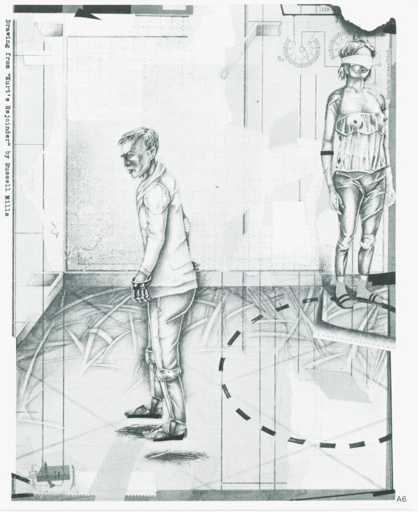 A small portfolio was put together for the album. This consisted of six pages of notes plus photographs. The photos can be found in the images archive. The paper inserts included a picture by Russell Mills, who at this time was working on the pictures thAat eventually became te More Dark Than Shark book. These are jpegs (up to 300k) as their grey background made them imposible to OCR without a lot of faffing about.