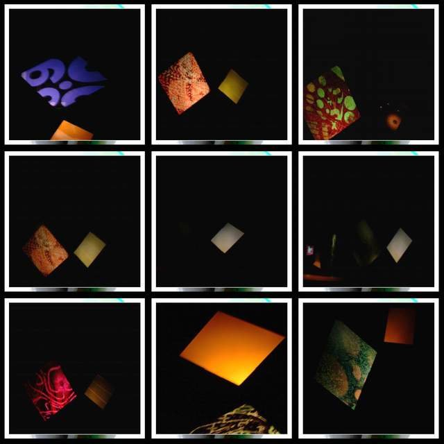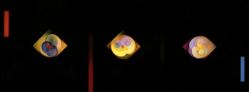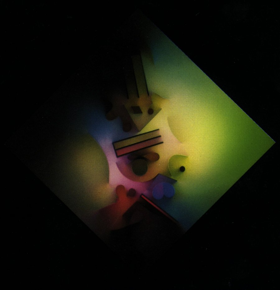 Pictures from 'Haloes on commonplace objects', the sound- and lightscape Eno installed in Hanover in October 1989. They are taken from a leaflet sold there. Details as follows: 6 pages 21 x 21 centimeters each, multicoloured pictures on black background.