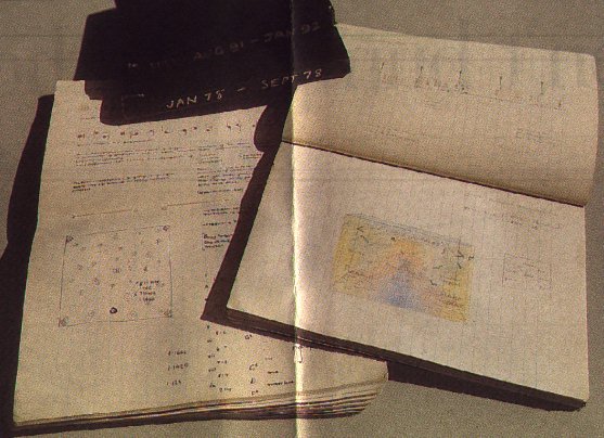 [Click here for a JPEG (64,944) of Eno's notebooks - details and caption below; picture by Peter Macdiarmid. Using sophisticated computer technology, we can simulate the look-and-feel of a scan from an actual newspaper article, complete with crease down the middle and newsprint show-through!]