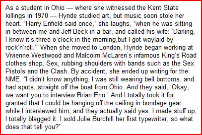 An article on Chrissie Hynde in The Sunday Times, 17 May 2009, said: